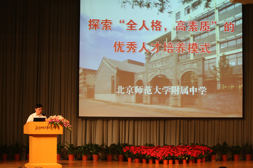 会议由市教委基教处李永生副处长主持,十所自主排课实验校(四中、师大二附中、101中学、师大附属实验中学、二中、盲校、师大附中、潞河中学、人大附中、中加学校)的校长先后发言,展示三年来各校自主排课和自主会考的实验成果,并对实验中的问题进行了相互交流、共同探讨。我校刘沪校长在会上做了题为“探索‘全人格、高素质’的优秀人才培养模式”的发言,介绍了我校在构建“全人格、高素质”课程体系、实施自主会考、探索优秀人才培养模式等方面的工作以及由此带来的学校变化。张铁道院长、臧铁军院长、刘月霞处长、罗洁主任等领导先后讲话,不仅肯定了十所学校的自主排课实验成果,而且也指出了今后的努力方向。