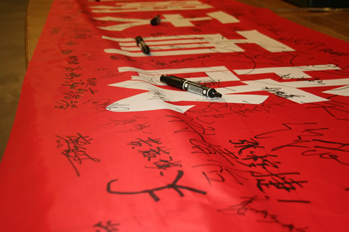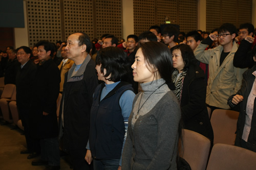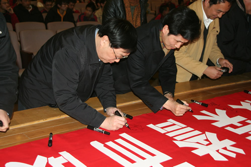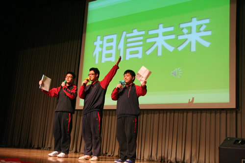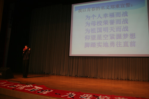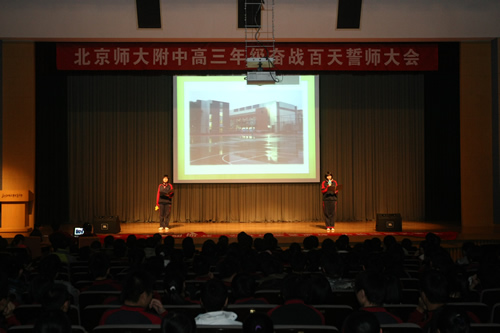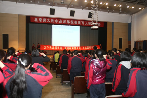 在距离高考100天的日子里,高三年级全体师生在无关键词会堂举行了奋战百天誓师大会。同学们深情朗诵了朱自清的散文《匆匆》、食指的诗歌《相信未来》,表达自己珍惜时间、不怕挫折、勇迎挑战的豪情和信念。各备课组教师为同学们送上了精心准备的幻灯片,表示要作同学们的坚强后盾。年级组长刘美玲老师激励同学们不忘父母的养育之恩、不忘附中的培育之恩、不忘中华儿女的责任和使命,全力拼搏,接受祖国检验和挑选。最后全体师生庄严宣誓:为个人幸福而战,为母校荣誉而战,为祖国明天而战! 刘沪校长等领导与高三师生一起在写有上述誓言的横幅上签名。