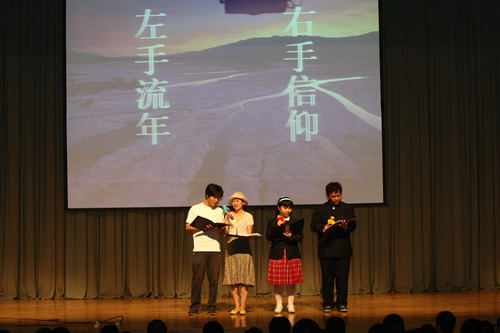音乐声轻轻地响起,大屏幕上依次出现的相片展现了四位同学从呱呱坠地到长大成人的成长历程,这些真实的记录不仅唤起了同学们成长的记忆,更让每一位高三的同学都意识到:自己真的长大了。接下来展示的老师们年轻时代的照片引起了同学们一阵阵激动的惊呼与掌声,看着曾经的青春与稚嫩,高三师生在共同感叹流年匆匆的同时感到彼此之间的距离更近了。在动人的音乐声中,刘美玲老师、付成学老师以及姬祎宁、刘博两位同学深情地朗诵了《左手流年右手信仰》,激励同学们在匆匆的流年中紧握信仰,做有良知有品格的人,在人生的道路上多一份家国天下的责任与担当。