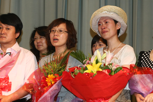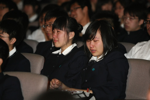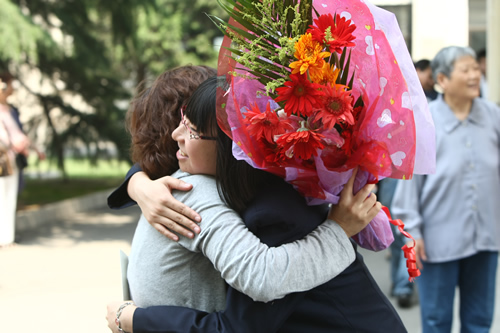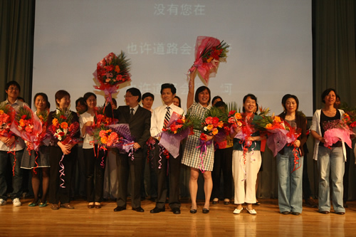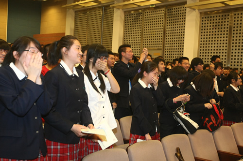 典礼的最后,所有的老师在音乐声中走上台,美丽的鲜花,深深的鞠躬代表了同学们对老师们最真挚的爱与感恩。面对着相伴三年,默默付出的老师们,台下的所有同学含着眼泪,情不自禁发自内心地喊出“老师,我们爱你!老师,我们爱你”的真情告白,感人至深。