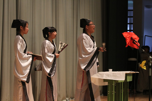 下午3:30,朗诵会在欢快热烈的气氛中拉开帷幕。同学们有的朗诵李白、王维的作品,有的朗诵苏东坡、辛弃疾的作品,有的朗诵秦观、李清照的作品,或慷慨激昂,或迂徐舒缓,或豪迈奔放,或委婉深情,展示了良好的文学素养。应邀前来参加朗诵活动的北京师范大学文学院“南山诗社”成员现场表演了精彩的古诗吟唱,给同学们留下深刻印象。