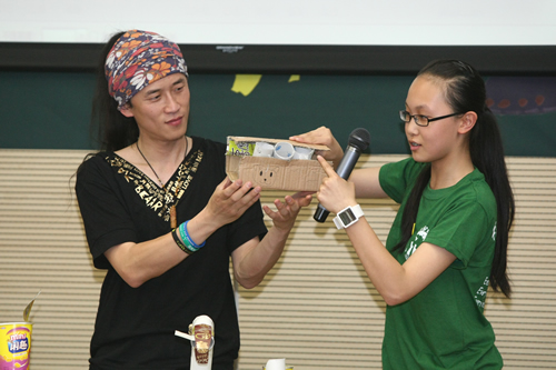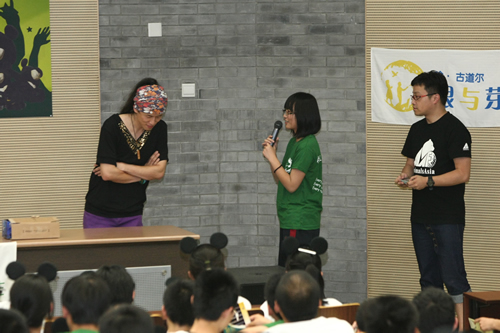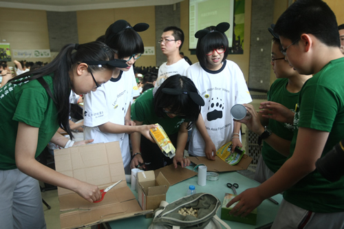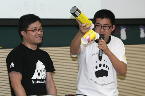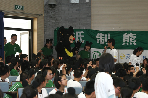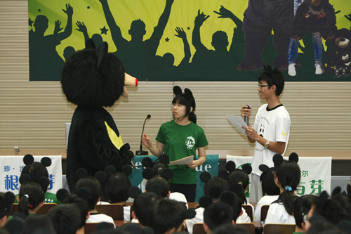 活动当天,所有参与活动的同学都身着根与芽与亚洲动物基金赠送的文化衫。活动开场,身穿可爱月熊服装的高三学长来到场内与同学们进行亲密互动;亚洲动物基金会高级教育主管Jacky向同学们讲述了亚洲动物基金保护黑熊的故事和经历,并带领同学们当场制作了月熊玩具。同学们做成的新颖玩具以及全校师生抵制熊胆制品的签名都赠送给了根与芽北京办公室。