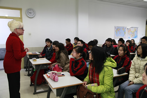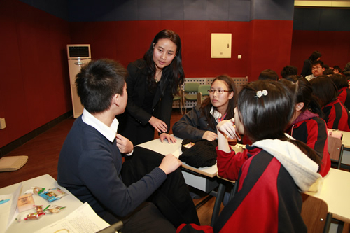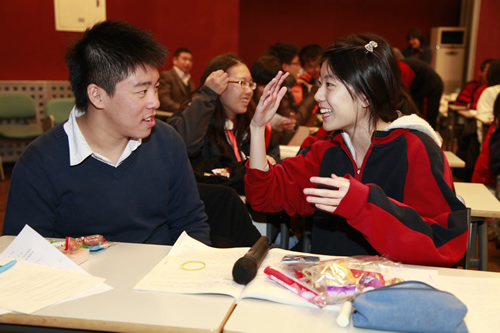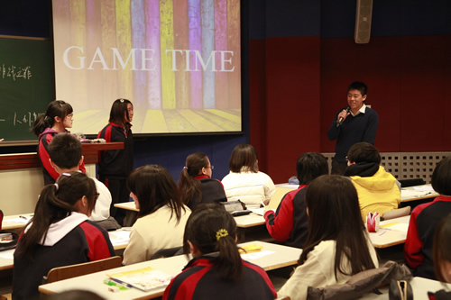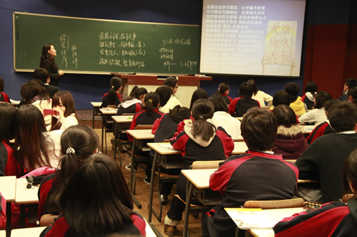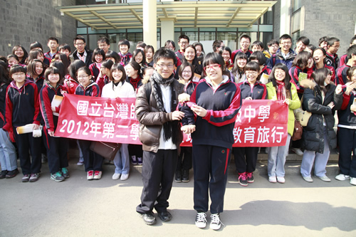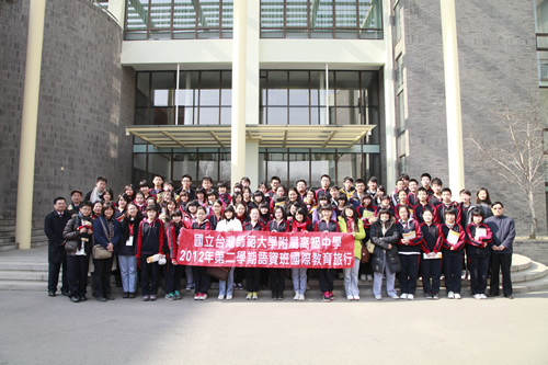 台湾师生一行首先参观了我校的文化景观――杏坛、三味书屋、民国时期台湾作家林海音曾读过书的师大附小教室楼和林砺儒校长塑像。接着他们和我校同学一起听了英语和语文课,分别是国际课程班外教讲授的TOEFL指导课和郑媛老师讲解的古文课。在感受了我校课堂之后,台湾师大附中的学生和我校学生进行了友好交流。交流活动由轻松的游戏――脑筋急转弯开场,现场气氛活跃。台湾同学合唱,我校同学也一展歌喉。两名台湾女同学还为大家表演了一段自编的牙买加风情舞,赢得全场的掌声和欢呼。同学们交流得热火朝天。半天的时间虽短,却让两岸师生加深了了解。大家相约像交流会上大家同唱的歌曲《友谊地久天长》一样。