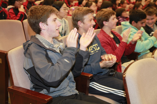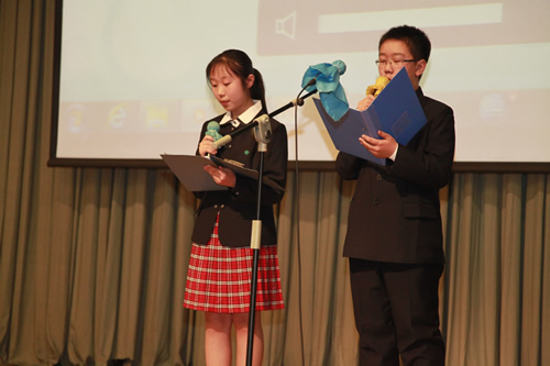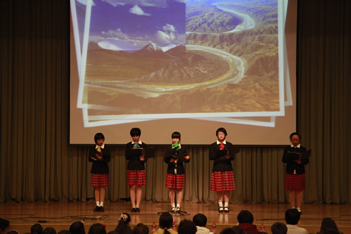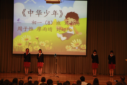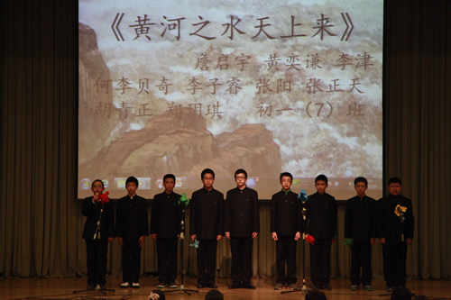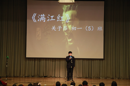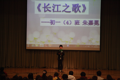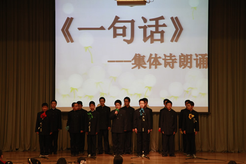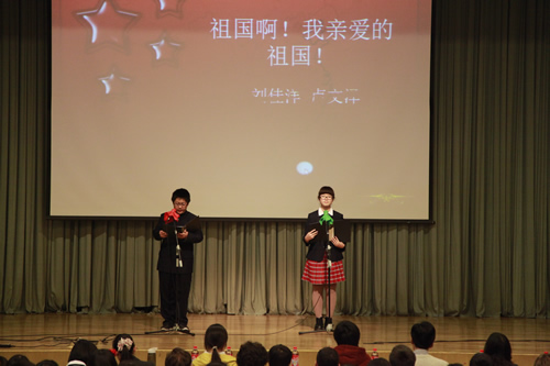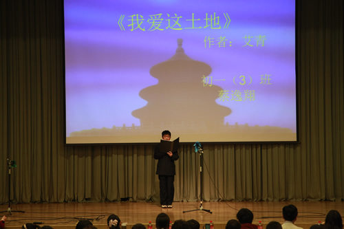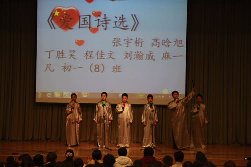 2012年3月26日下午,我校初一年级全体师生成功举办了“祖国,我为你歌唱”诗歌朗诵会,整个礼堂洋溢着高涨的爱国情怀,充斥着选手们挥斥方遒的青春豪情。