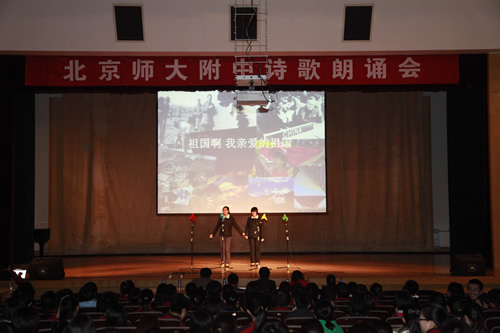 高一(4)班的王诗雨、郑慧、郭为嘉、王子豪朗诵《相信未来》,开启了新诗朗诵会的第一章。随着高一(6)班秦伟臻同学“那就从我的血肉之躯上/去取得/你的富饶、你的荣光、你的自由”的朗诵声渐渐高昂,会场的气氛也渐渐热烈。同学们的朗诵声一波一波地从舞台上传出回荡在礼堂中,,每个字符、每个韵脚都传递出同一个声音――我爱你,中国!