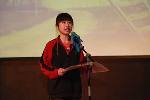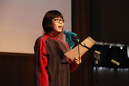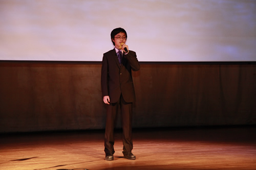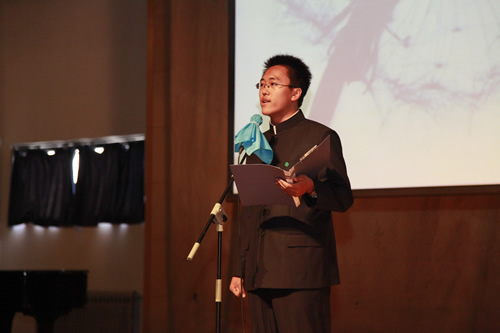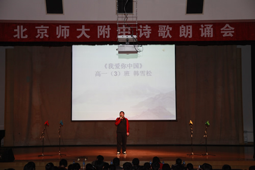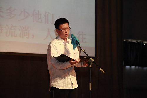爱国之歌余音缭绕,朗诵会已进入第二章――“心灵的吟唱”。浑厚的滔滔江河般的声音化成小河,奏出舒缓而轻快的旋律。高一(5)班程子研同学的原创诗歌《那些年》让同学们深受触动。高一(4)班的施浩、邯翘同学在朗诵诗歌的同时加入了表演,温婉的嗓音和动人的表演将同学们带入了诗歌婉转缠绵的意境中。