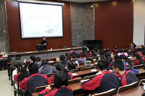 张一南老师是北大中文系一位人气极高的老师,她所作的讲座内容是“李商隐的无题诗”。张老师向前来聆听的200多名高中学子深度解读了李商隐的一组著名的无题诗:“来是空言去绝踪” “飒飒东风细雨来” “含情春晼晚” “何处哀筝随急管”。张老师语言诙谐幽默,极富有时代感,讲座内容则兼具专业性和艺术性,不时博得阵阵掌声。在她的娓娓而谈中,同学们不仅认识了“天才博士”李商隐,加深了对李商隐的诗歌写作手法的理解,更感受到了北大思想自由、兼容并蓄的学术氛围。