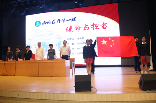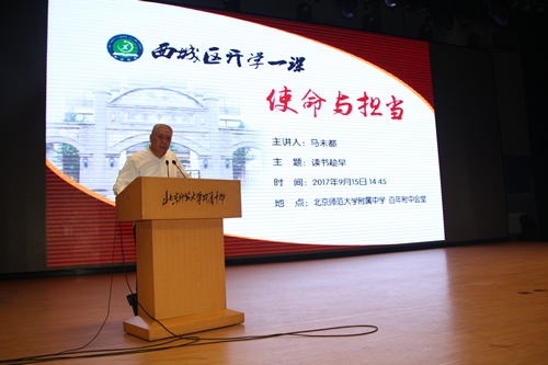 9月15日下午,在无关键词无关键词会堂隆重举行了以使命与担当为主题的“西城区开学一课”活动。本次活动邀请到了著名文物鉴定家、收藏家、观复博物馆创始人马未都先生主讲。无关键词高一年级450余名师生和来自鲁迅中学、三十一中的师生代表怀着激动和期盼的心情对于马先生的到来报以雷鸣般的掌声。 马未都先生讲课开始前,西城区人民政府司马红副区长、师大附中王莉萍校长分别致辞,表达对马未都先生的热烈欢迎和对青年学子的殷切期盼;西城区教委张燕军副主任为马未都先生颁发了“西城区开学一课授课专家”的聘书。马未都先生从“读书趁早”的独特角度,热情洋溢地分享了他对于“使命与担当”的理解。马未都先生深入浅出,旁征博引,谈古论今,诙谐生动,为师生们上了别开生面的一课!他告诫同学们要爱国家、爱汉字,爱经典,爱唐诗宋词、爱中华文化;告诫同学们读书要趁早,要勤苦,要自信。马先生的授课充满知识趣味,更充满人生智慧,带给师生关于使命与担当的深入思考和深沉启迪。互动环节,同学们踊跃举手提问,气氛热烈。
