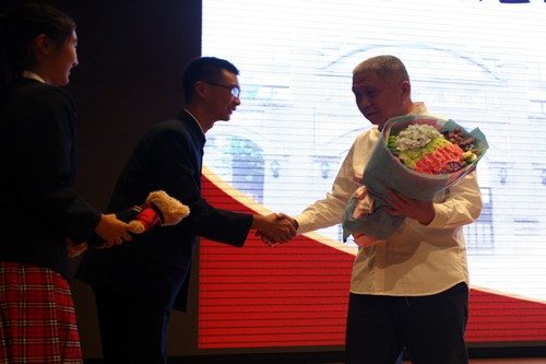 讲座结束之际,同学们怀着仰慕和崇敬的心情向马未都先生献上鲜花和可爱的附中校服熊。