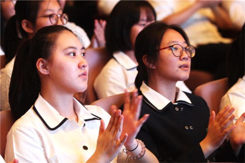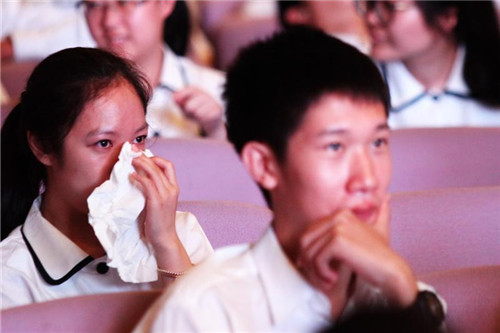 由初三学生创作的附中生活视频,带领大家重温在附中学习生活的时光,台下许多同学热泪盈眶,对母校的依恋之情充满百年会堂。