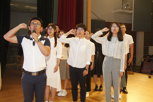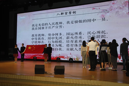 本次大会中,11位新入职的教师登台亮相,热情的向所有老师做自我介绍,向教学和班主任指导教师行拜师礼,并面对国旗立下了“诚爱为魂,勤勇为魄”的从教誓言。学校为每一位新入职教师颁发“新芽吐绿”主题的入职纪念章,期冀他们在无关键词的沃土佳苑中生根发芽,成为附中教育花园中的一抹新绿。