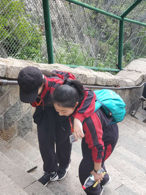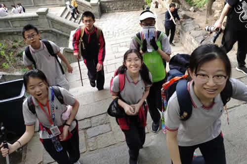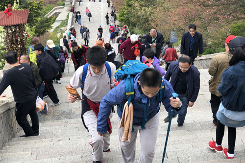 10日清早七点左右,高一全体师生的内心缓缓燃起了勇攀高峰的激情,由山脚下的红门开始登山。海拔约1545米的泰山对同学们来说是个不小的挑战。一路上,大家挥洒汗水,奋勇向前,挑战自我,突破极限, 竭尽全力发挥自己的潜能,成功登顶。在攀登过程中,“置身霄汉”“雄峙天东”等豪情万丈的摩崖石刻让人惊叹,山间的苍松翠柏和烂漫山花也令人驻足。但比这些景色更为令人印象深刻的,是同学间团结友爱的画面。其间有些同学也曾因迷惘无助而想要放弃,但是此时总有一双强有力的手,或是接过我们背上的包,或是递来一瓶矿泉水,简单而平凡的举动却蕴含着极大的能量,它们仿佛在宣告着:“我们要同甘共苦。”