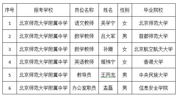 我校作为北京市级优质教育资源统筹学校,根据北京市关于事业单位公开招聘的有关规定,拟招聘下列人员到统筹学校工作,现予以公示。