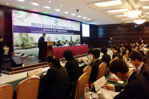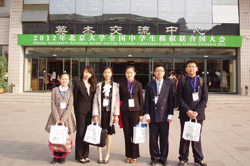 3月29日至4月1日,我校教师张媛媛、王斌、唐铭带领模联6人代表团赴北大参加了第八届全国高中生模拟联合国大会(PKUNMUN2012)。 本次会议共有近百所重点高中参加,与会代表分别在10个委员会展开讨论。我校代表团代表毛里塔尼亚和捷克参加了4个委员会的会议和31日晚的地球村活动。