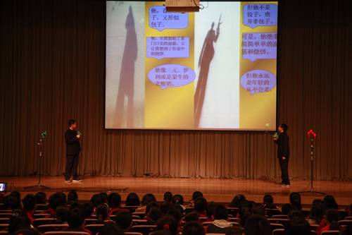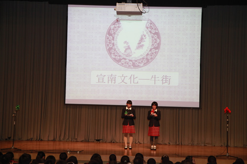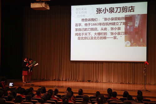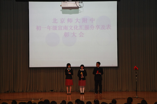 2012年3月5日下午,初一年级全体师生召开了“宣南文化研究性学习分享及表彰大会”。各班同学以诗朗诵、实地考察视频展示、情景剧等多种形式,分享了他们在“宣南文化研究性学习”活动中的收获和成果。