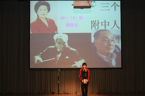今年是我们师大附中建校110周年,初一年级组把本组的语文教学活动和年级活动组合在一起,举办“附中人的故事”讲故事比赛。全体学生积极参加了这次比赛,当天讲述故事的同学都是从各班挑选的优秀讲故事成员,他们所讲的故事中不仅有科学家钱学森、老校长林砺儒这样的众所周知的伟人的故事,还有数学家闵嗣鹤、作曲家麦丁、评书表演艺术家连丽如、天文学家张钰哲、著名指挥家艺术家李德伦等各方面杰出附中人。初一年级全体同学在学习《100个附中人的故事》活动中积极踊跃,全员参与,共同了解附中的历史,讲述附中人的故事,在活动中学生们充分感受到了身为附中人的光荣与责任,决心以优秀附中人的精神来勉励自己,积极向上,为附中增光。