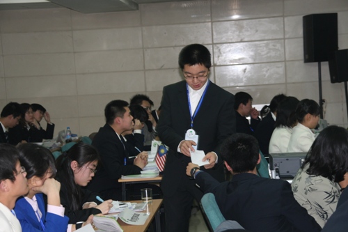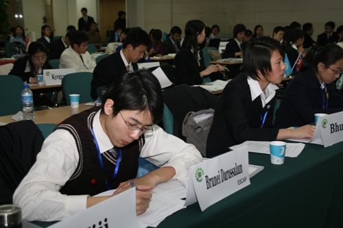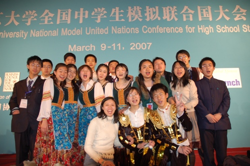 3月9-11日,“北京大学2007年全国中学生模拟联合国大会”在北大英杰交流中心隆重举行,来自全国38所中学400多名优秀学生参加了这次会议。我校高一、高二年级的15名学生在任莹、王雁红、邰美秋老师的带领下参加了会议。其中,10名同学分别代表德国、文莱、吉尔吉斯斯坦、加纳和斯洛文尼亚五个国家,在安理会、妇女地位委员会、亚太经社委员会、世界卫生组织各个委员会中充分得体的体现了所代表国家的立场,展现了我校学生的风采,获得“优秀组织奖”。5名观摩团的同学负责会议现场“意向条”传递者的工作,并承担起本校此项活动的准备和诸多服务工作的重任。在地球村的展示活动中,我校所布置的德国展台,受到了与会的其他代表国家的老师、学生们的高度评价,特别是当学生们身着德国民间服饰,跳起了德国民间舞蹈时,赢得主席团成员和各国代表的热烈掌声,成为本次大会的一大亮点。