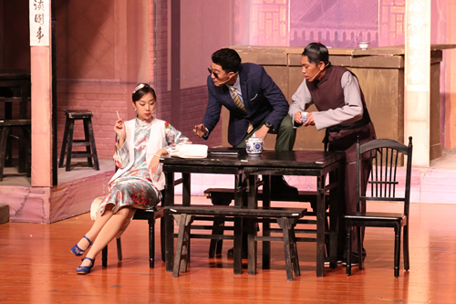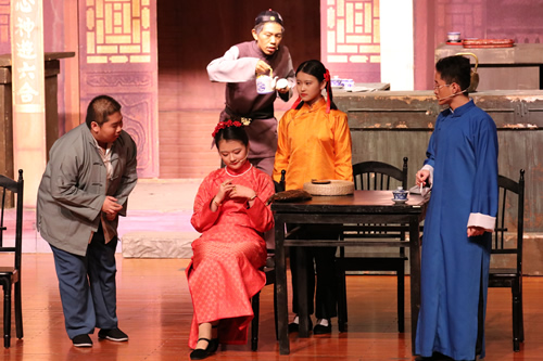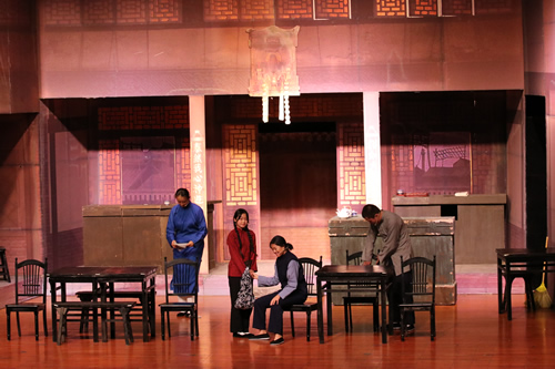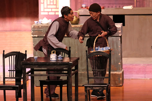 《茶馆》是现代文学家老舍于1956年创作的话剧。剧作展示了戊戌变法、军阀混战和新中国成立前夕三个时代近半个世纪的社会风云变化。通过一个叫裕泰的茶馆揭示了近半个世纪中国社会的黑暗腐败、光怪陆离,以及在这个社会中的芸芸众生。而我校演出的第三幕将老舍先生的原著中的王掌柜上吊自杀的结局改编为开放式,也体现出了我校师生对文学作品的把握能力。