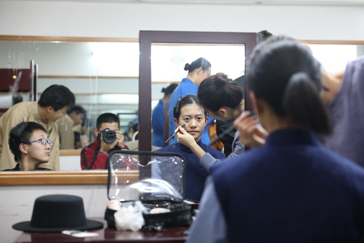 11月30日和12月1日,虽然演出时间分别在傍晚或晚上,但演员们每次还是午饭后便提早来到现场,进行舞台合成调试以及服饰、妆容的准备。而这一切都是为了更贴切的演绎出《茶馆》中或典型或平凡的人物形象!