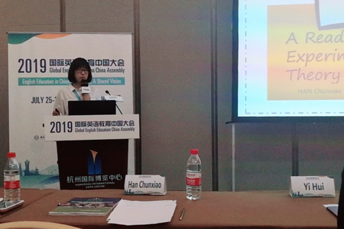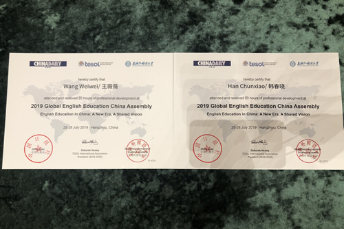 2019年7月25日,以“中国英语教育:立足时代、融通中外”为主题的2019国际英语教育中国大会在杭州国际博览中心开幕,近3000名海内外高校英语教育专家、中小学英语老师等参加会议。其中,我校英语组王薇薇、韩春晓老师代表我校参会,交流互鉴英语教学理论实践、展示我校英语教学探索成果。