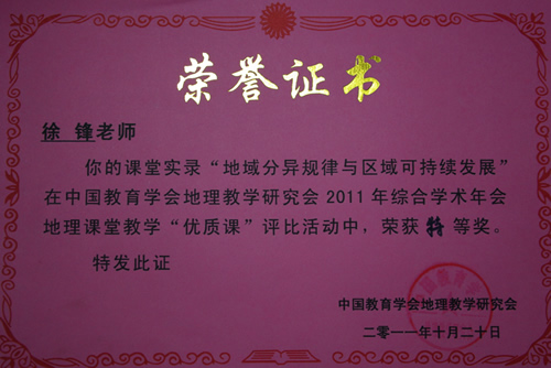 2011年10月20-24日,中国教育学会地理教学研究会2011年学术年会在贵阳召开,我校徐锋老师作为北京市代表参加会议,所提交的“地域分异规律与区域可持续发展”一课在优质课评比中荣获全国特等奖。与会期间,徐锋老师在贵阳一中做了现场优质课展示,并针对获奖优质课做了交流发言,展现了无关键词教师的高水平和北京市西城区地理教科研领先全国的实力。