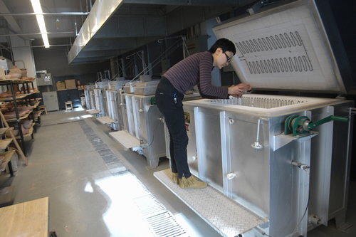 张老师为学生的作品装窑