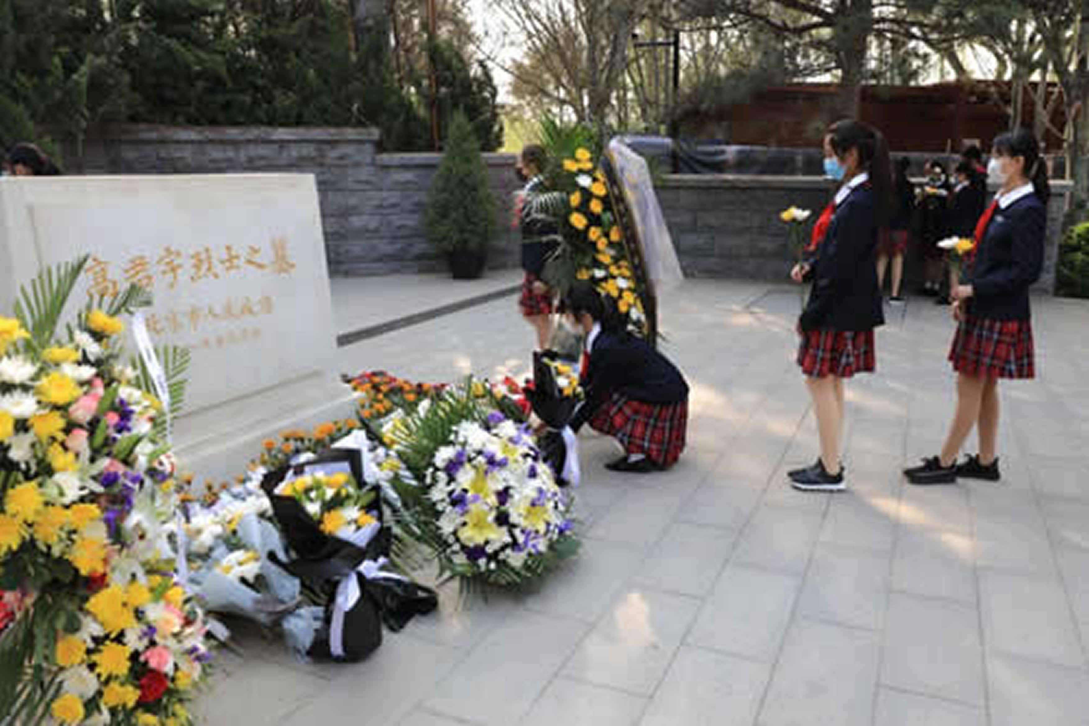 少先队员们向高君宇烈士和石评梅校友敬献鲜花,深深鞠躬,表达对他们的缅怀之情。