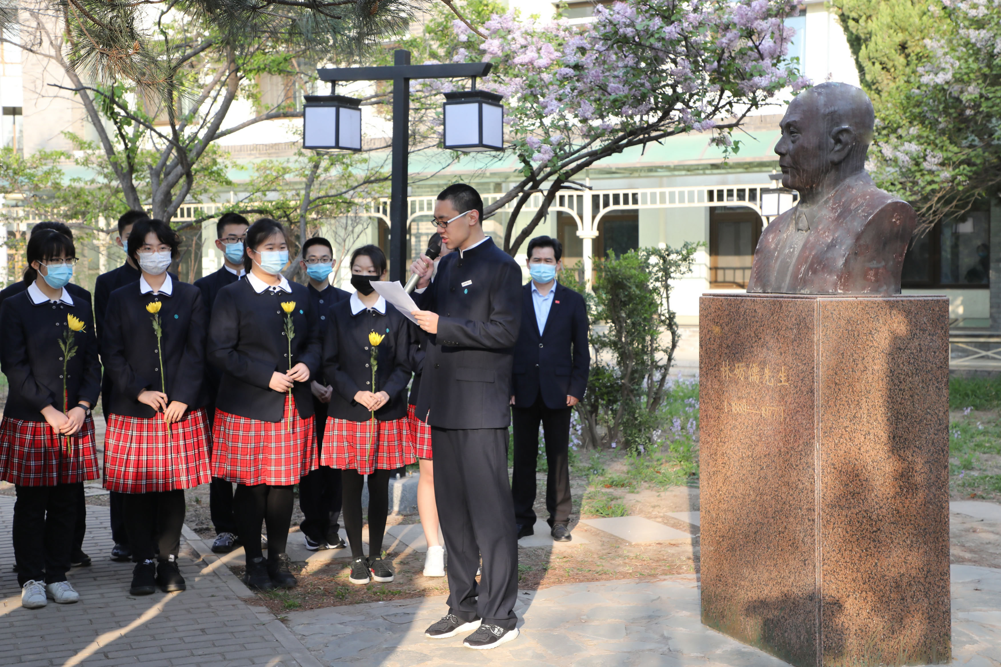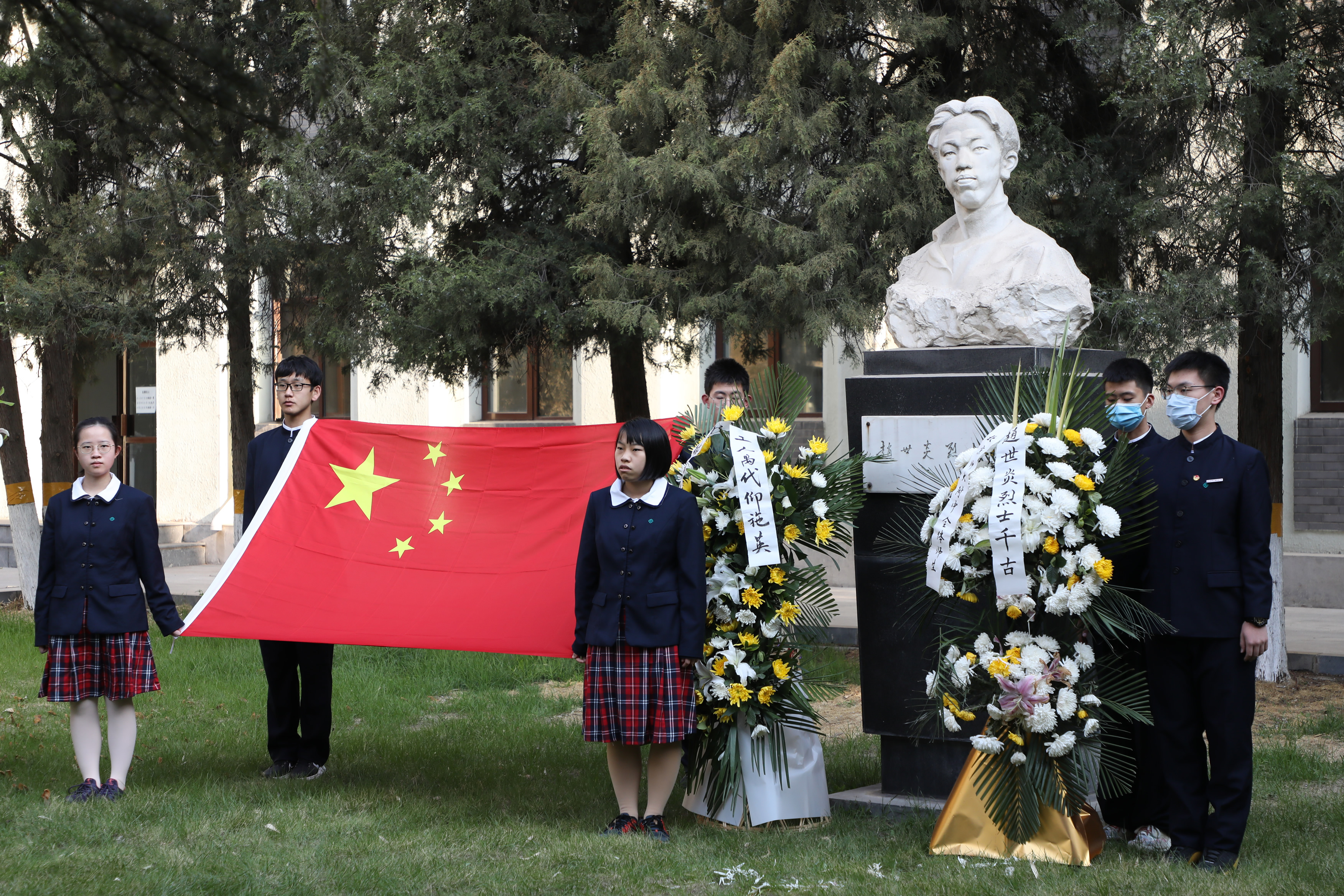 2021年4月6日清晨,我校师生代表分别汇聚在附中校园内的赵世炎烈士像、林砺儒像、钱学森铜像前,隆重举行“清明缅怀附中英烈,同心凝聚青春力量”主题团日活动。