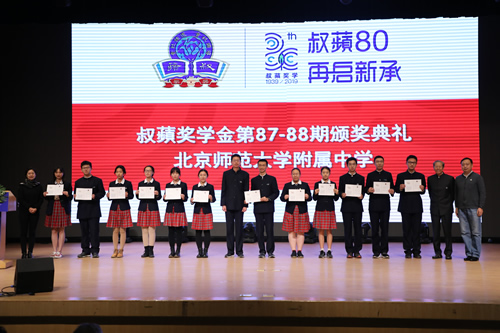 叔蘋奖学金历史悠久,是由香港知名爱国人士顾乾麟先生于1939年在上海创办,始终以“得诸社会,还诸社会”为宗旨,资助奖励了大批青年学子。至2019年,上海、北京、湖州、阜阳四地已有设奖学校40余所,涉及高中、大学以及中等职业教育、特殊教育等多种学校类型。叔蘋奖学金的重要特色是连续获奖原则,即学生自中学首次得奖后如成绩优秀,可以连续获奖至大学毕业,在获奖学生的成长道路上影响重大。1988年叔蘋奖学金开始在北京设奖,我校有幸成为北京市首批三所设奖学校之一。截止到今年,我校现已有200多人获得叔蘋奖学金。30年间,这些从附中走出的叔蘋同学,他们经过附中全人格教育理念的洗礼,他们秉承着叔蘋的教育思想“得诸社会,还诸社会”,个个都成为了国家的中流砥柱,成为了以国家发展为己任的优秀人才。
