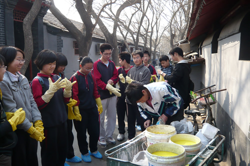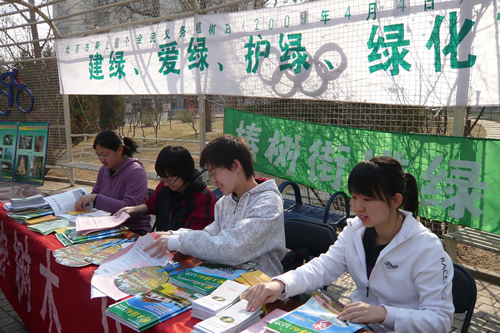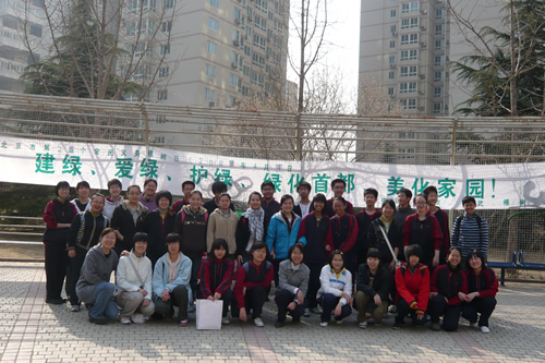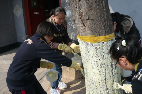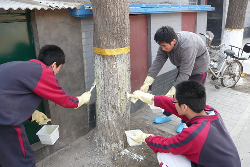 4月4日上午九点,活动在椿树园小区中心花园准时开始。高一、高二近40名志愿者分成两组,一组同学负责在街道所属社区粉刷树木,为树木防虫;一组同学负责发放环保宣传资料并向社区居民宣讲植绿护绿知识。在同学们的共同努力下,百余棵树在两小时内全部刷完,有的同学意犹未尽,还高兴的和自己“护”过的树合影留念。任务的圆满完成得到了社区领导和居民的高度赞扬。