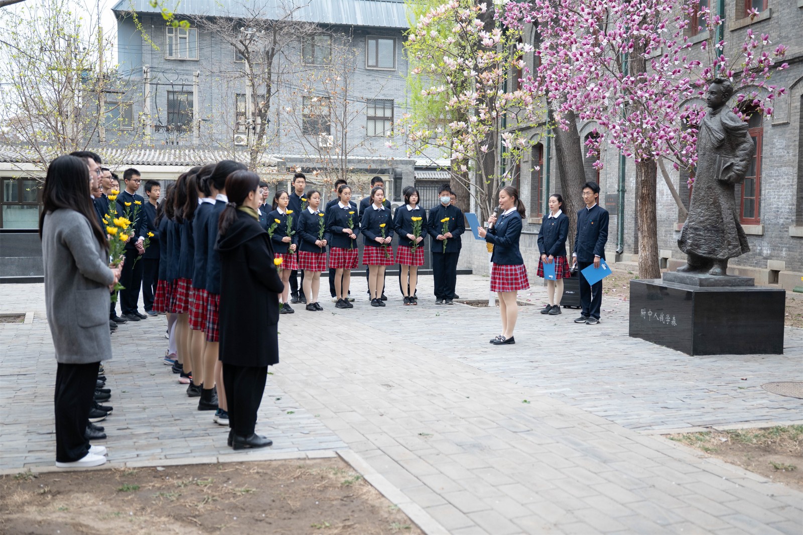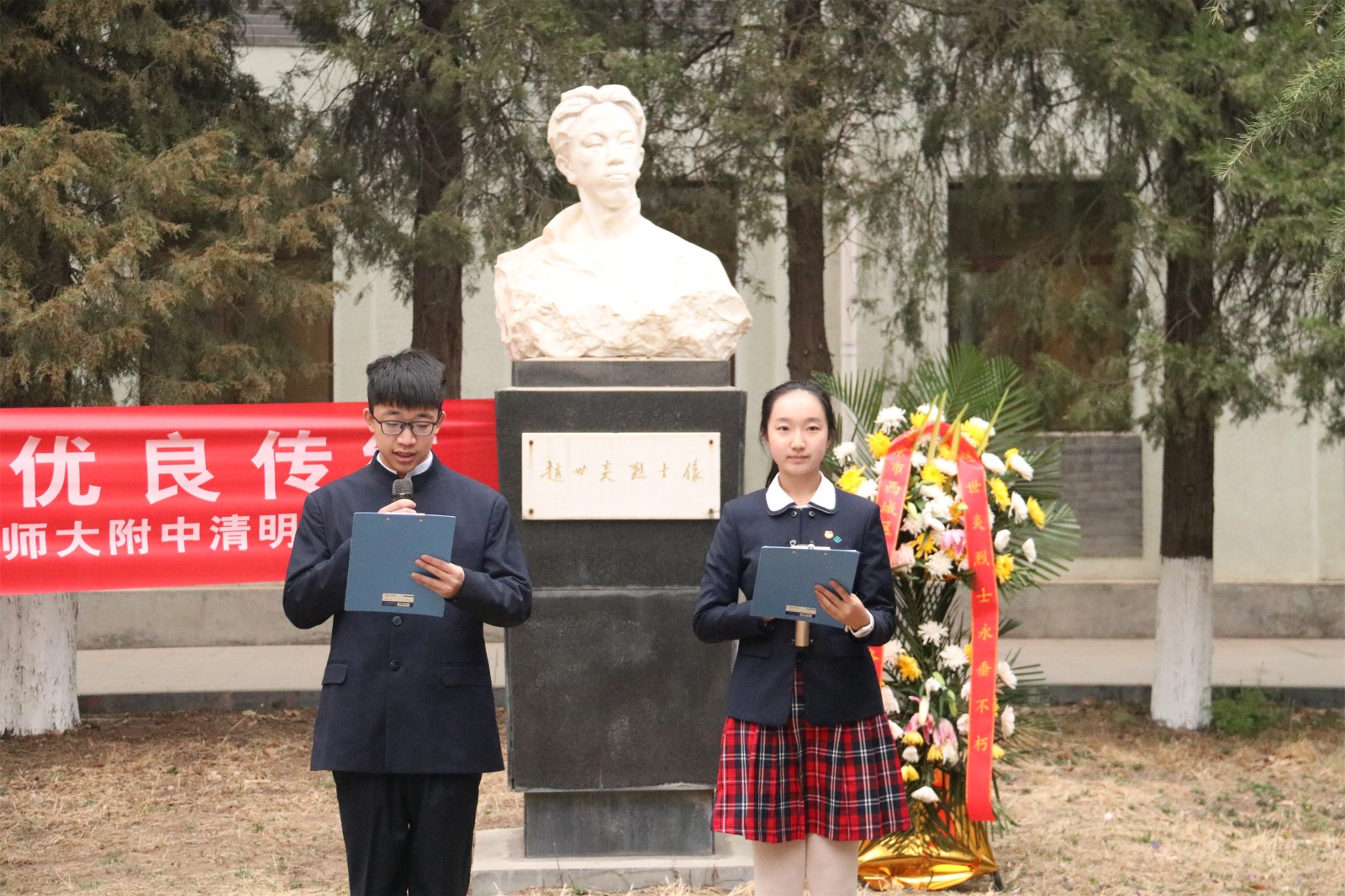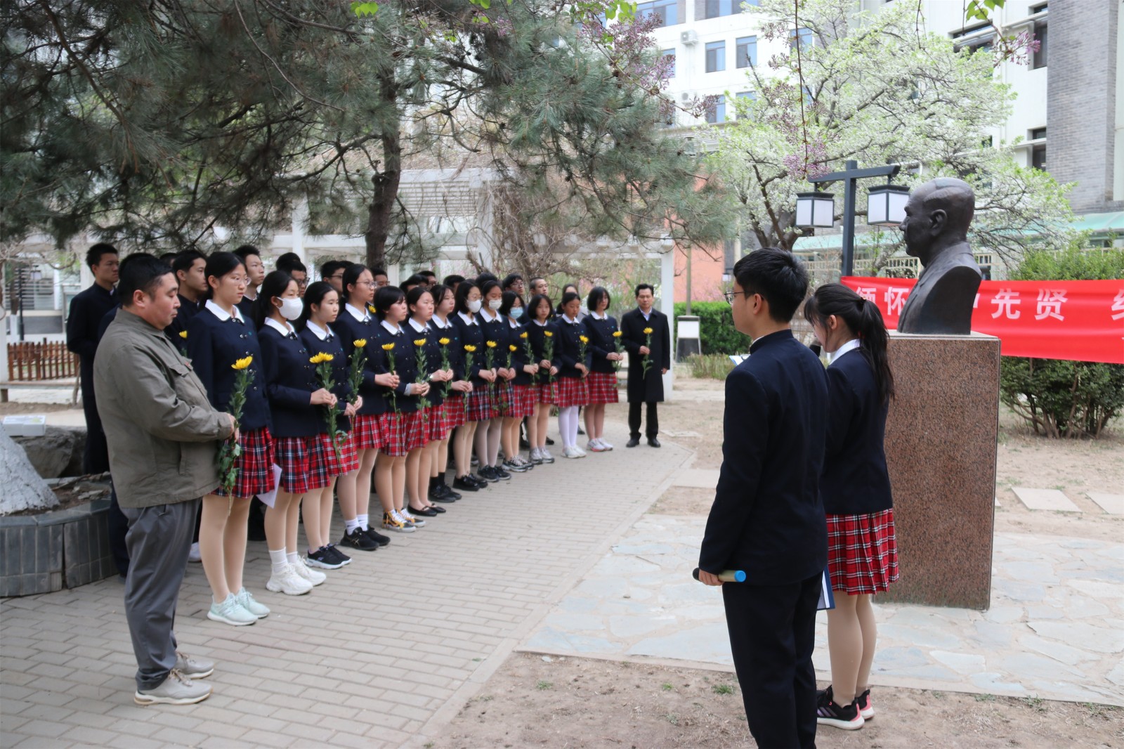 在东区校园赵世炎烈士像、林砺儒校长像和钱学森像前,附中师生代表手持菊花低首肃立。出国旗、唱国歌,读祭文后,师生代表分别向附中的老校长和两位杰出校友行三鞠躬礼并敬献鲜花,表达附中人对先辈们的追思与景仰。
