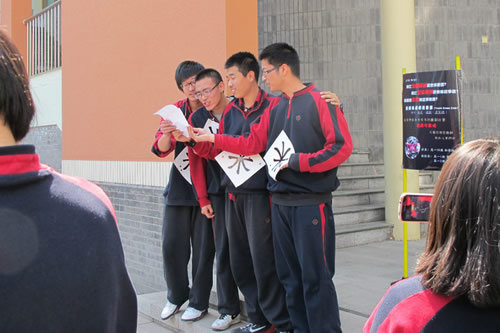 周二、周四班级街头艺人展示。在综合楼前,高二七班的四个男生们带来了十分搞笑的换大米,高一4班模仿马里奥,初二2班带来了吉他弹唱,初一3班表演了相声《卖核桃》,初二8班全班同学集体齐唱西城男孩的歌曲,初二1班的女生们带来多首英文歌曲,初一6班带来了民乐合奏,恰好处在小花园里的花刚刚开放时,别有一番意境。附中校园内一片欢歌笑语,同学们在喜欢的演员身上贴好小红花,为喜欢的演员投票。