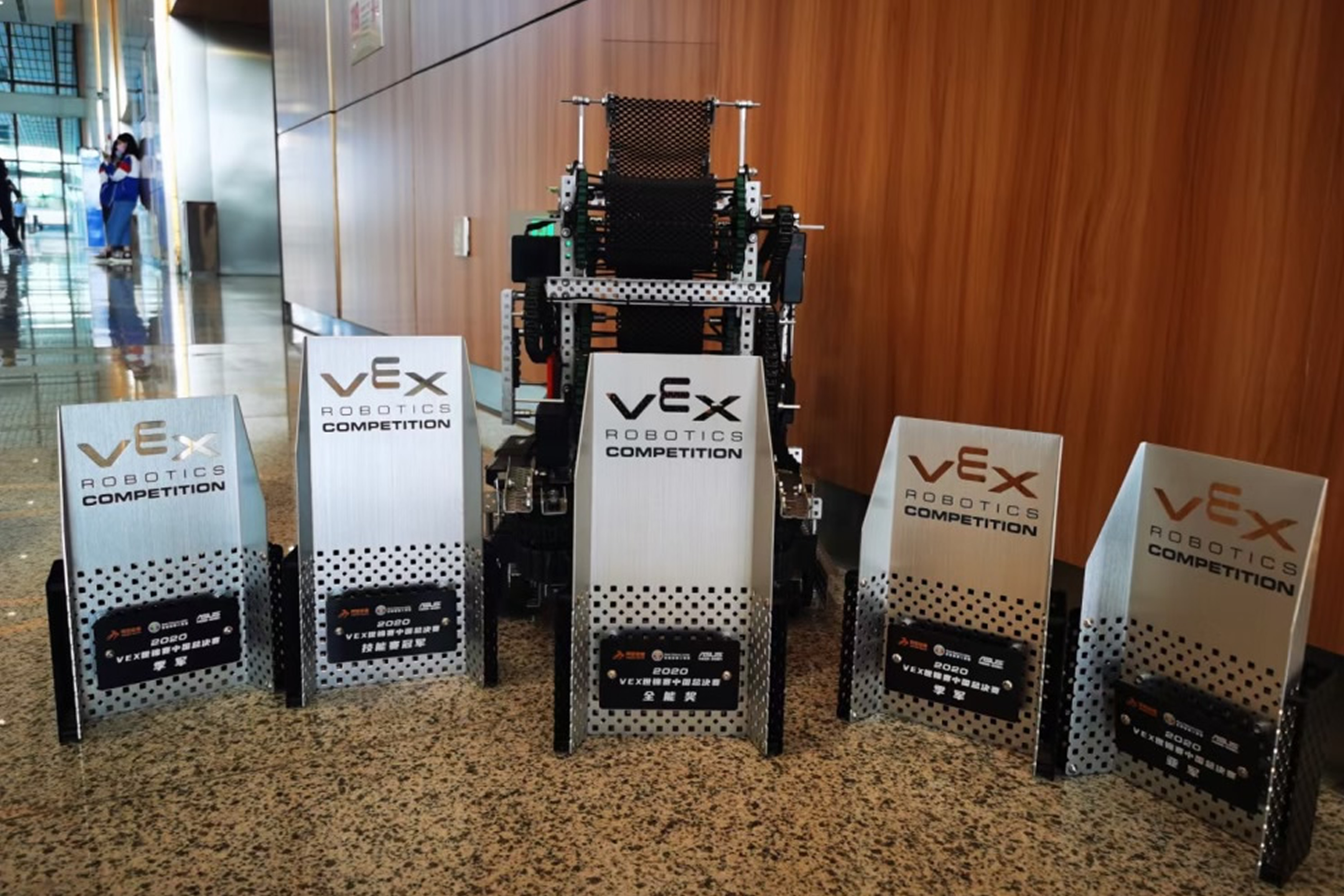 自2020年4月比赛主题发布,我校VEX机器人社团开始着手准备比赛,十几位队员在老师的带领下,利用选修课以及课后时间设计方案、搭建机器人、调试程序、练习操控。一年来,队员们的专业技术、解决实际问题的能力、比赛中的心理素质、团队合作能力都得到了提升。在本次比赛中,同学们配合默契,表现出良好的团队精神和竞技状态,最终获得五项大奖:高中组全国亚军(高中一队)、高中组全国季军(高中二队)、初中组全国季军(初中队)、技能赛冠军和全能奖。