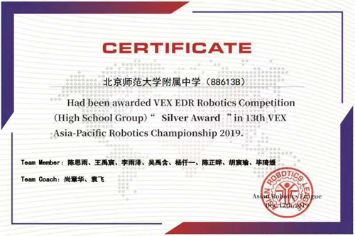 第十三届VEX亚洲机器人锦标赛2019年12月10日在韩国开幕,来自中国、美国、韩国等多个个国家和地区的360支队伍、将近2000人次参加。此次亚锦赛包含了VEX EDR初中,高中,VEX IQ小学初中等2个大项4个组别。我校VEX机器人社团陈思雨、李雨泽、王禹宸、吴禹含、胡宸瑜5名同学参加了VEX EDR高中组的比赛,赛前两个月,同学们利用课余时间积极备赛,完成了编程、结构设计、战术选择等工作。最终获得的亚洲机器人锦标赛银奖,指导教师为科技组尚章华老师。