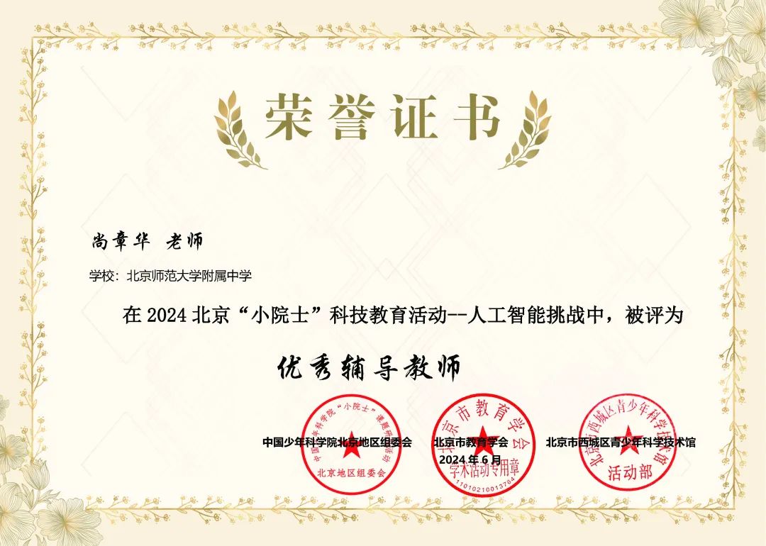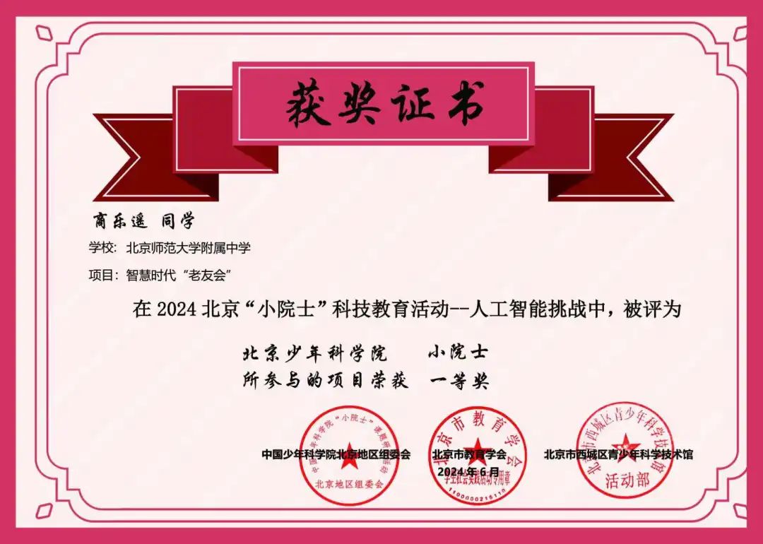 6月16日北京“小院士”人工智能挑战赛经过激烈的网络初评,最终遴选出创意构想展示项目20组在北京三十五中(高中部)参与线下终评答辩,我校学生商乐遥同学的《智慧时代“老友会”》经过答辩,最终获得了一等奖,辅导教师尚章华获评优秀辅导教师。